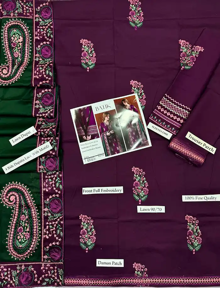 Your Batik Unstitched Embroidered 3-Piece Lawn includes: