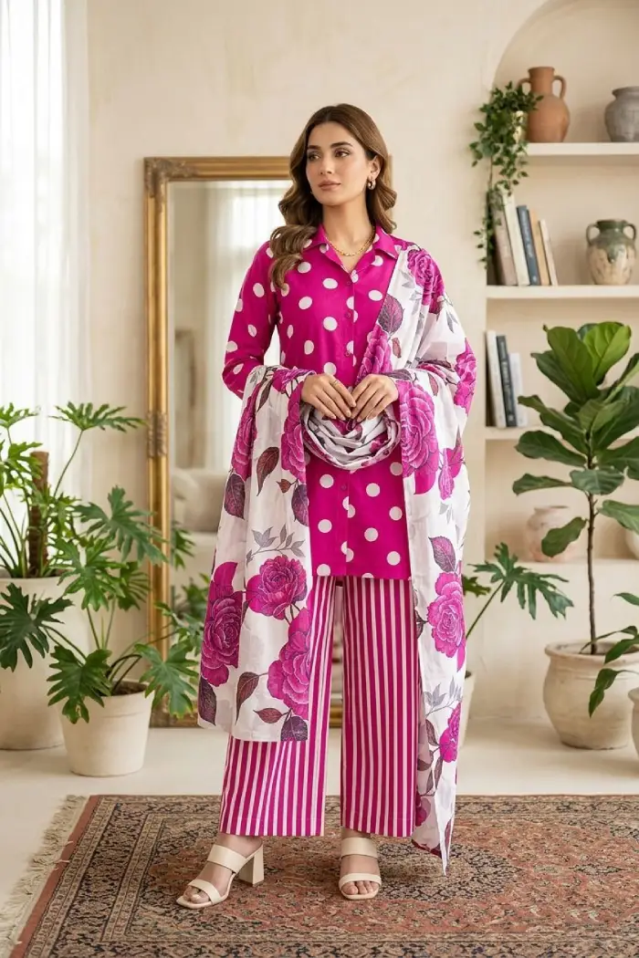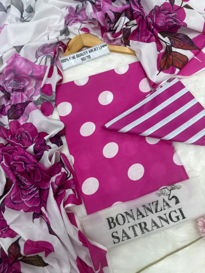 The Bonanza Satrangi Lawn set comes with a beautiful lawn dupatta that adds an extra layer of elegance to your outfit. Whether you choose to wear it with the dupatta draped gracefully or something more casual, the ensemble is incredibly versatile. This 3 piece set allows you to experiment with your style, letting you mix and match accessories to create your signature summer look. Elevate your wardrobe with the Bonanza Satrangi Lawn Collection, where comfort meets style.
