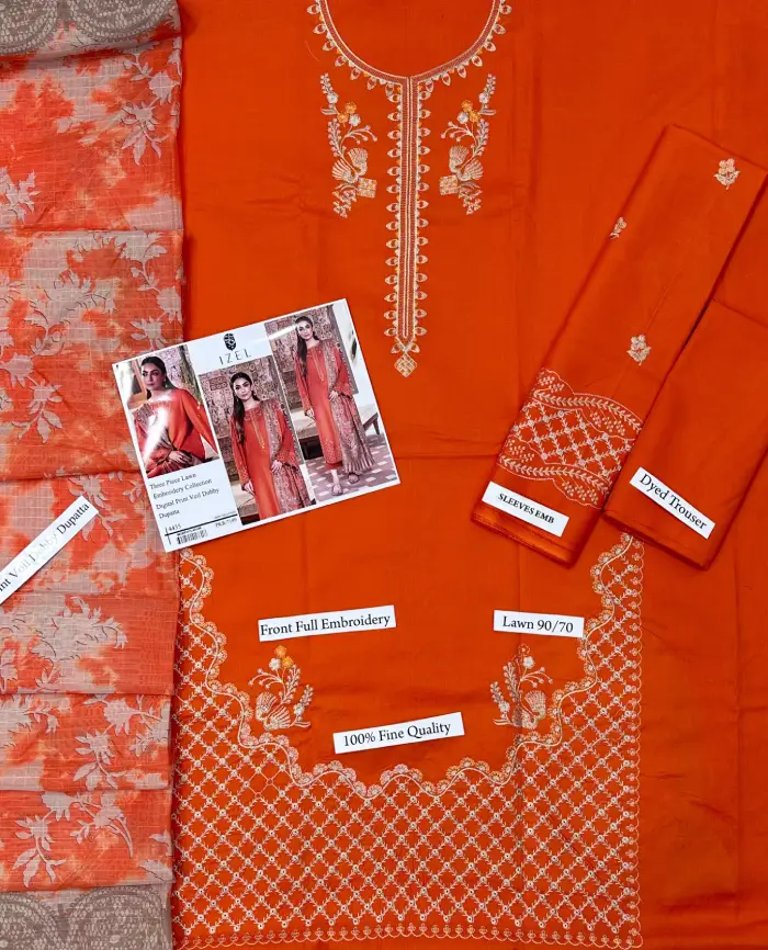 The Izel Lawn collection is crafted from high-quality lawn fabric, renowned for its softness and durability. The breathability of the material makes it ideal for warmer climates, allowing you to stay cool without compromising on style. Paired with a delicate Voil Dobi dupatta, this ensemble offers a sophisticated touch that enhances your overall look.