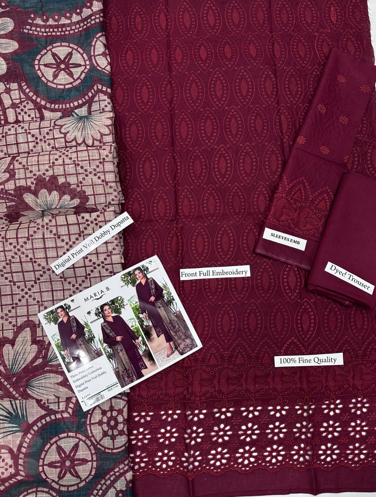 Mariab 3pcs Embroidered Lawn Suit with Voil Dobi Dupatta