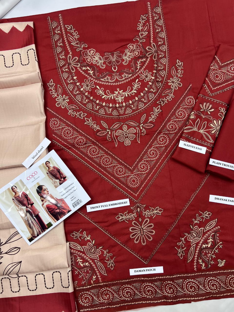 The centerpiece of this collection is the intricately embroidered suit, featuring fine detailing on its luxury fabric that exudes refinement. The dhanak embroidered shawl is the star of the attire, combining modern embroidery techniques with cultural patterns that add depth and character to the overall look. Perfect for semi-formal and formal winter gatherings, this design captures the essence of effortless beauty. Whether you’re attending a family celebration or a special event, this ensemble will make heads turn.