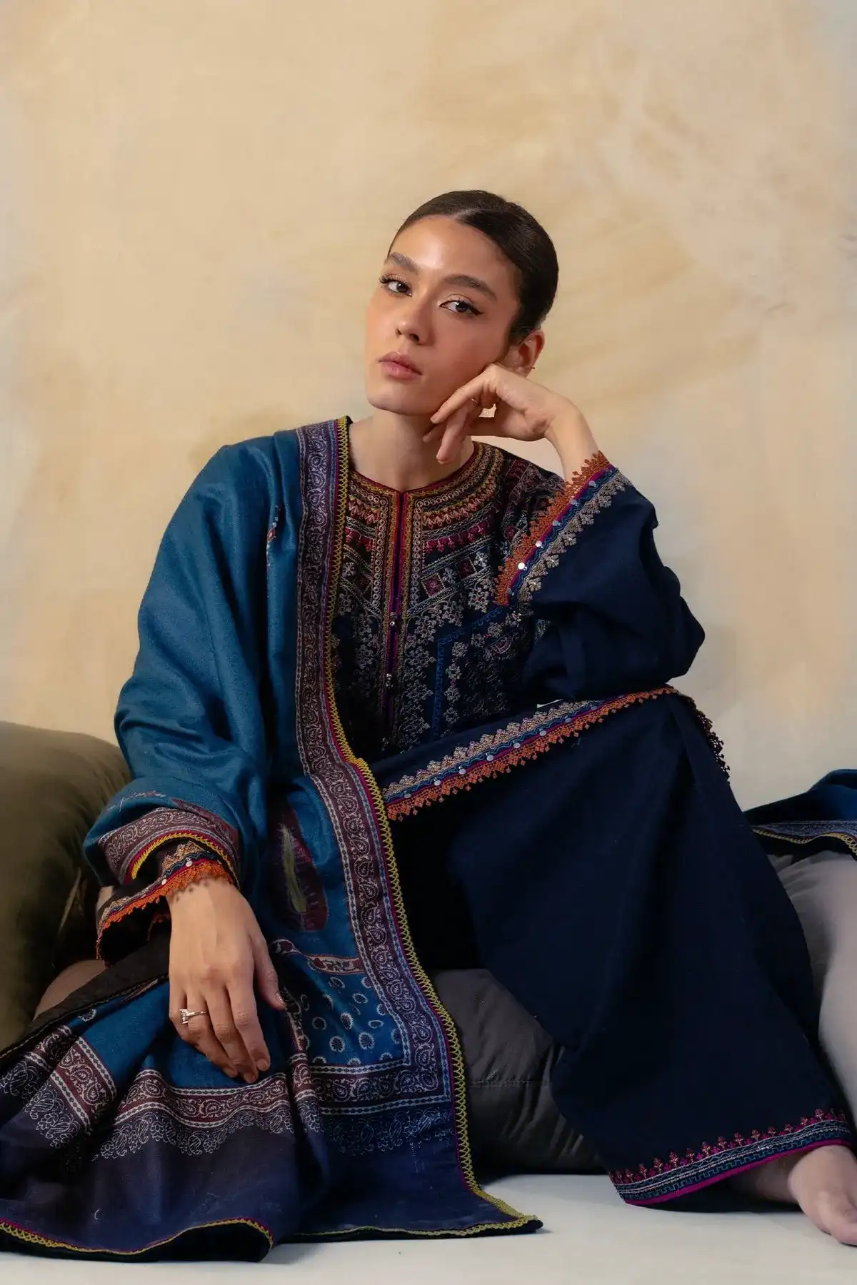 The centerpiece of this collection is the intricately embroidered suit, featuring fine detailing on its luxury fabric that exudes refinement. The Lawn embroidered shawl is the star of the attire, combining modern embroidery techniques with cultural patterns that add depth and character to the overall look. Perfect for semi-formal and formal Summer gatherings, this design captures the essence of effortless beauty. Whether you’re attending a family celebration or a special event, this ensemble will make heads turn.